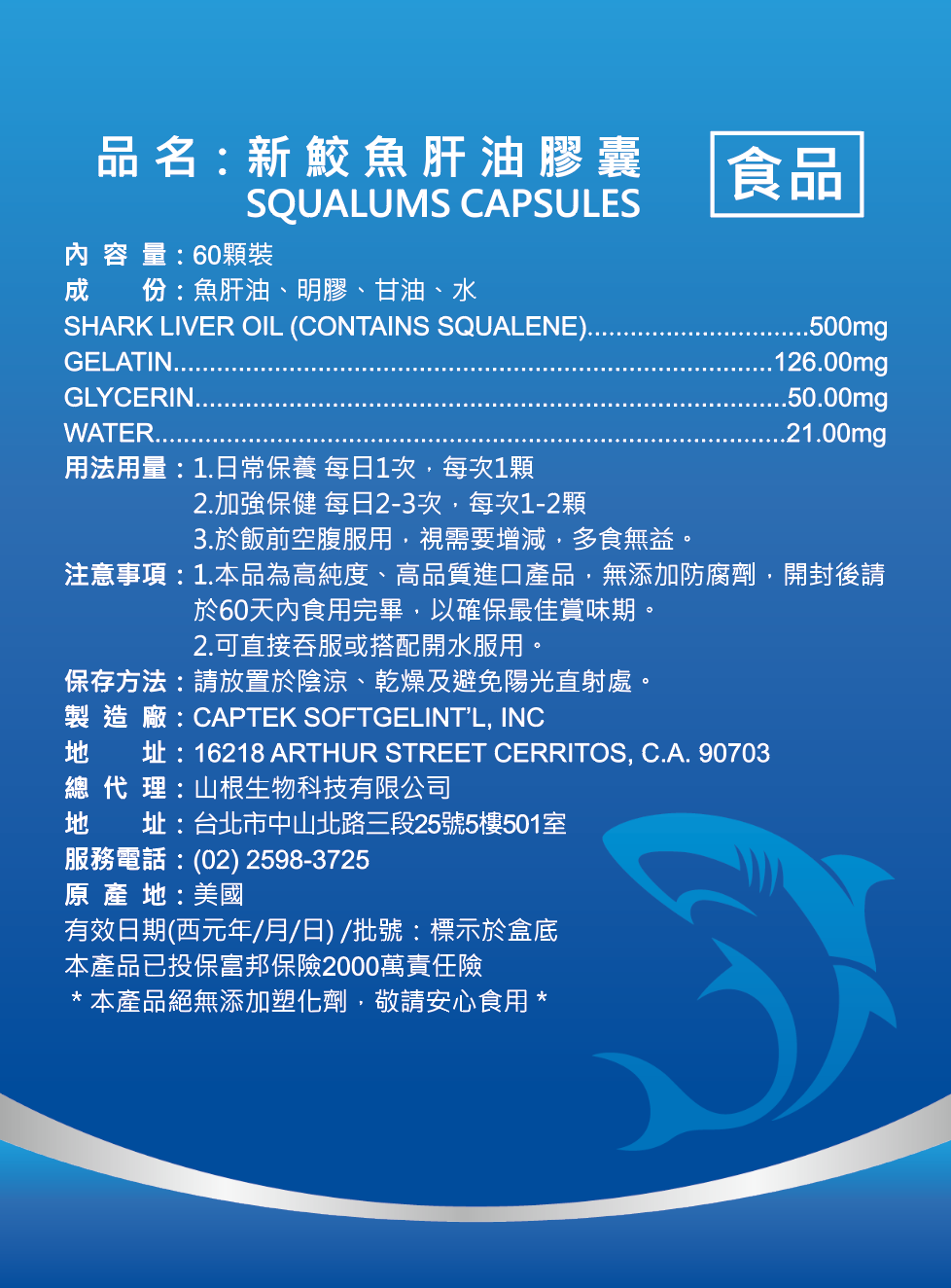 【山根】新鮫魚肝精 美國 深海鮫魚油 鮫鯊烯魚肝油 天然活性 深海魚油